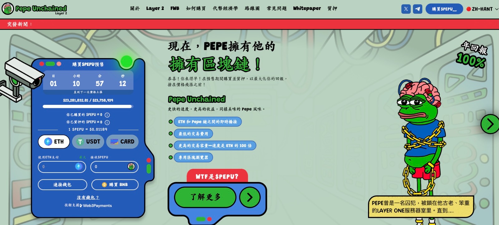 在Popcat幣引領市場的同時,另一個迷因幣項目Pepe Unchained($PEPU)也吸引了不少關注。Pepe Unchained在預售期間就達到了2300萬美元的募資里程碑,展現出其未來的市場潛力。該幣基於Layer-2區塊鏈技術,旨在緩解網絡擁堵問題,這一特性使其在迷因幣市場中獨樹一幟。