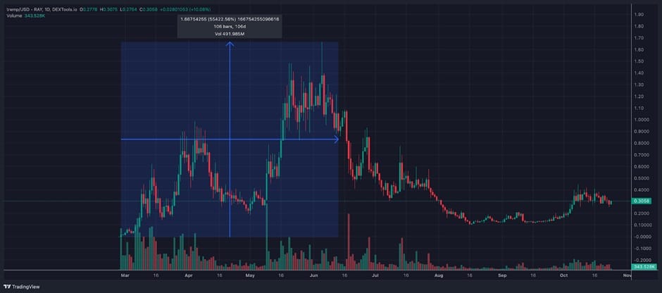表現優異的特朗普幣Maga Hat ($MAGA) 於5月在以太坊鏈上推出,最高為買家帶來了287倍回報,而基於Solana的TRUMP於3月推出,買家在初始上市價買入時獲得了554倍的增長。
