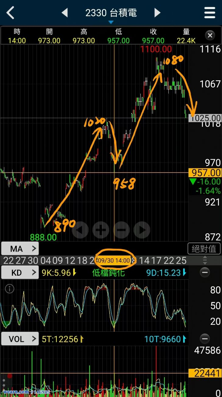 九月底台積電摜破958後,即精準測出反彈高點會到1080附近😎,回檔滿足點也已預告會修正到哪!😏
