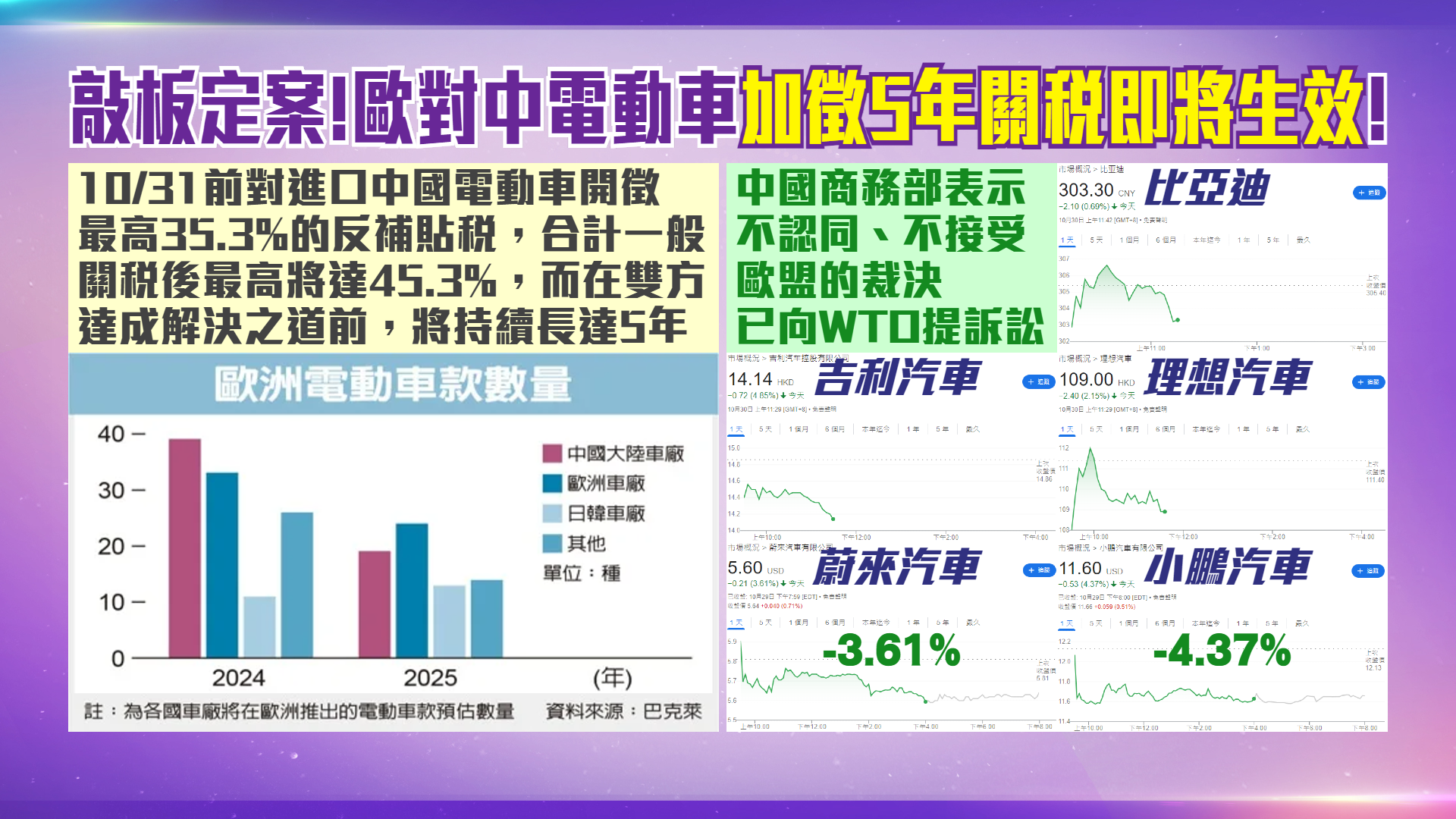 歐盟批准對中國電動車徵收最高45.3%關稅,對抗中國政府的補貼政策。而此舉似乎打中痛腳,中國商務部新聞發言人憤怒表示,中方「不認同、不接受」歐盟的裁決,並已向世界貿易組織的爭端解決機制提訴訟。商務部更威嚇,中國會採一切必要措施,保護企業的合法權益。