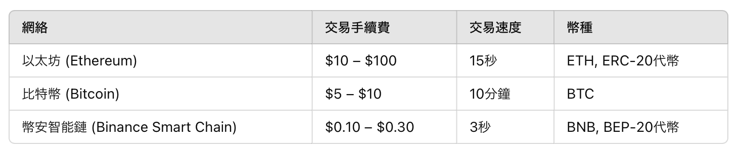 幣安智能鏈(Binance Smart Chain)以其低成本著稱,交易費用通常低於$0.10。
