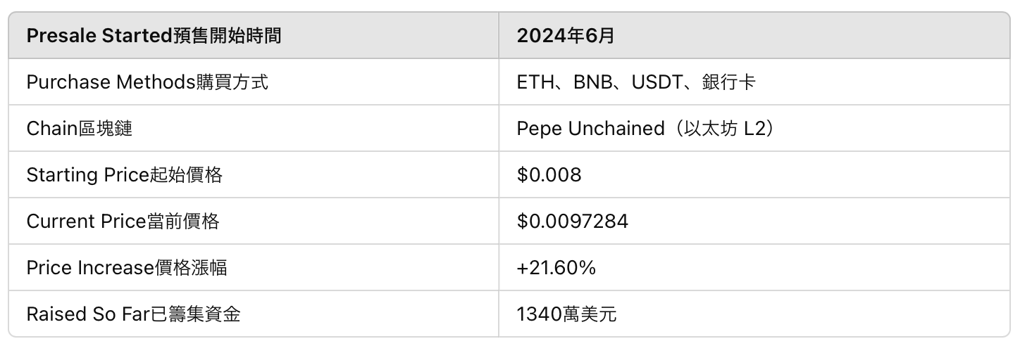 這項堅實的用例是 $PEPU 可能成為下一個 MEXC 新幣上市的原因之一。這種看漲情緒得到了 Pepe Unchained 預售活動的支持;到目前為止,已有超過 1340 萬美元的投資。目前仍有機會在首次交易所上市前享受預售折扣。今天投資,每個 $PEPU 的價格為 $0.0097284。