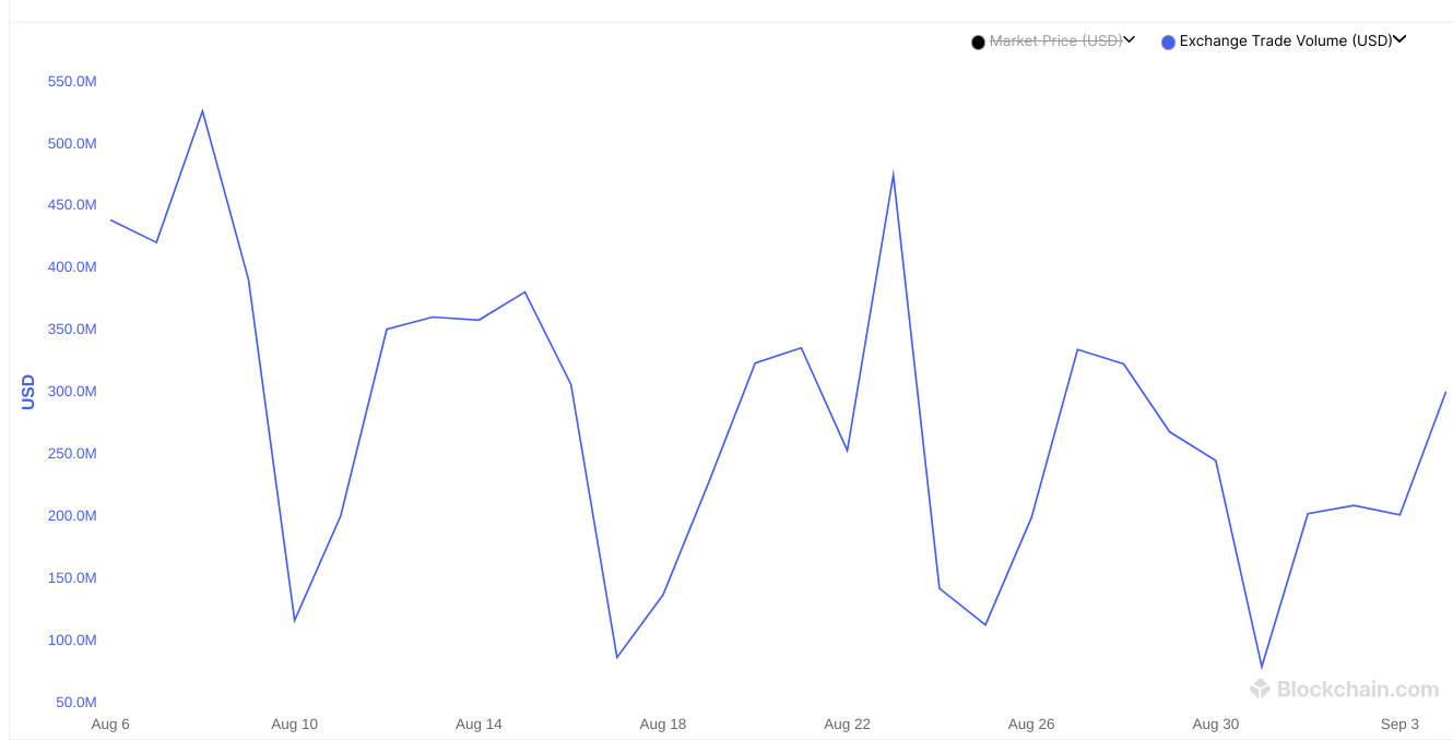 在上面的月度圖表中,從2024年8月初到9月初,週末的交易量顯示出比特幣(BTC)交易量的顯著下降。