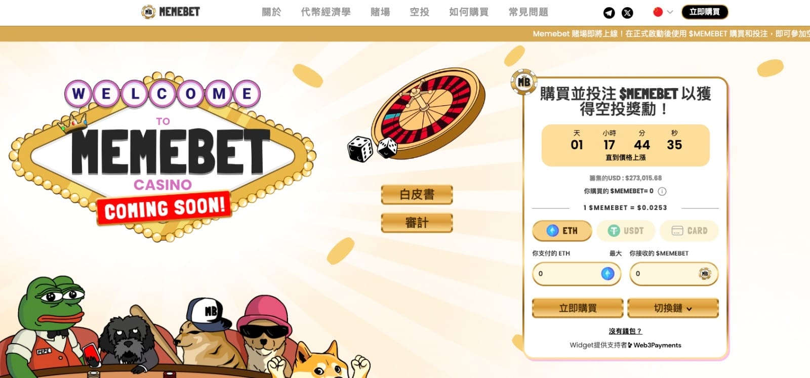 Memebet Token ($MEMEBET) 是一個支持 Meme 幣支付的賭場和體育博彩平台。玩家可以從私人錢包中存入 DOGE、SHIB、PEPE、BONK、WIF 等幣種。該賭場將支持數千種賭博產品,包括輪盤、視頻撲克、二十一點、刮刮卡、骰子和百家樂等。