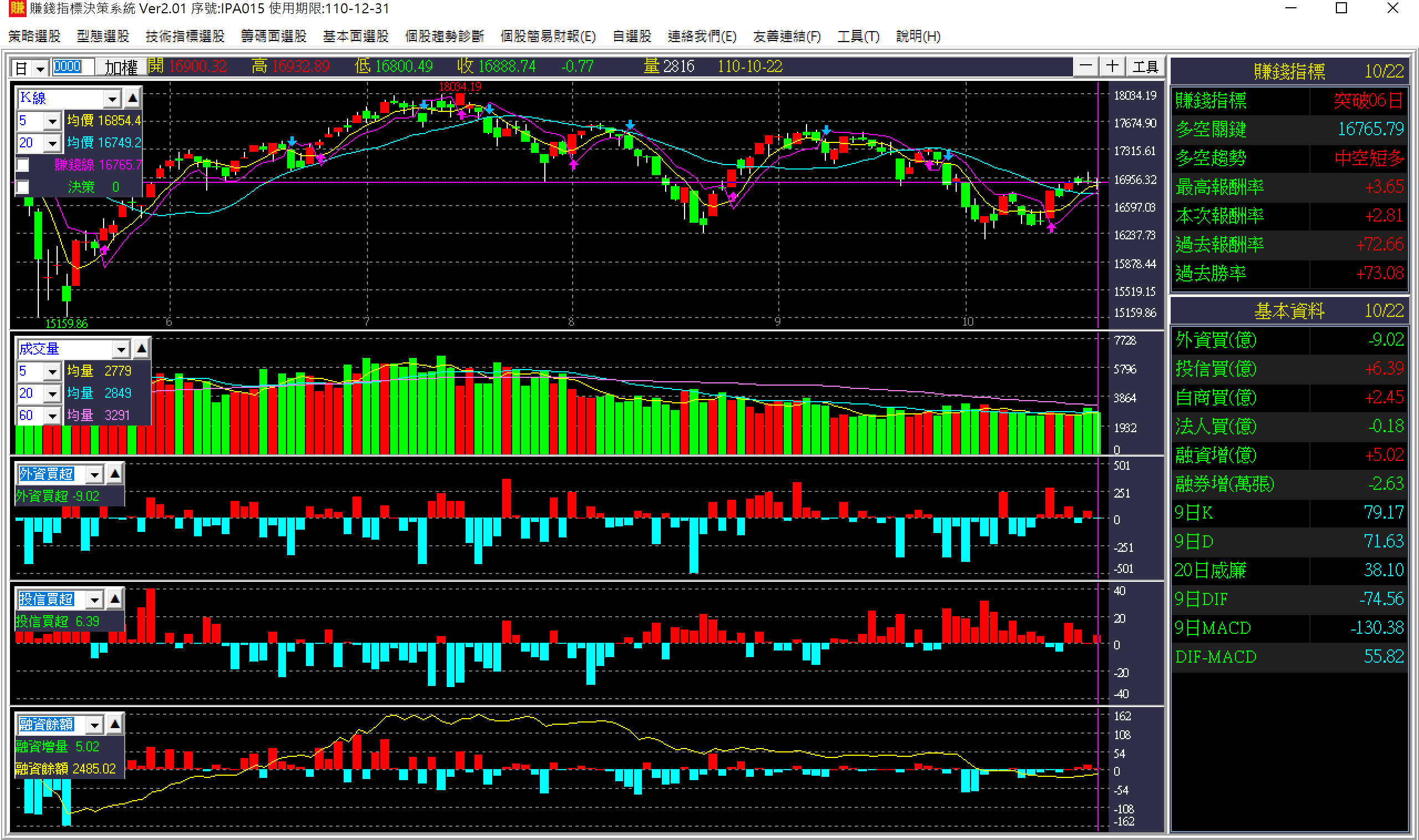 上週五大盤是『賺錢指標』突破訊號第6天,明天的「多空關鍵」在10765,依照目前台期指以及美股表現,下週出現跌破訊號的機會相當高,所以我的建議就是多方降低持股,可以開始佈局空方股票!