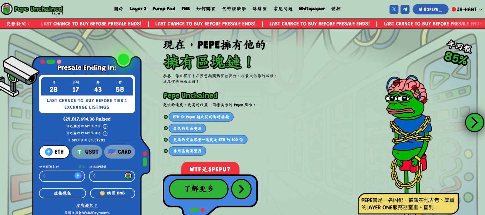 與Pepe幣主要依賴市場情緒不同,Pepe Unchained($PEPU)則通過技術創新贏得市場認可。$PEPU構建了基於第2層區塊鏈Pepe Chain,專注於解決乙太坊高gas費與低效能問題。這一創新使$PEPU交易速度提升100倍,成本更低,對現有迷因幣如$DOGE與$SHIB形成強烈競爭壓力。