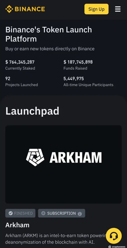 Binance Launchpad 創建於 2018 年,是 Binance 旗下新加密貨幣眾籌平臺。加入 Launchpad 代幣可以固定代幣價格向投資者募集資金,類似於加密貨幣預售。一旦專案達到籌款目標,通常會在 Binance 主交易所上市。
