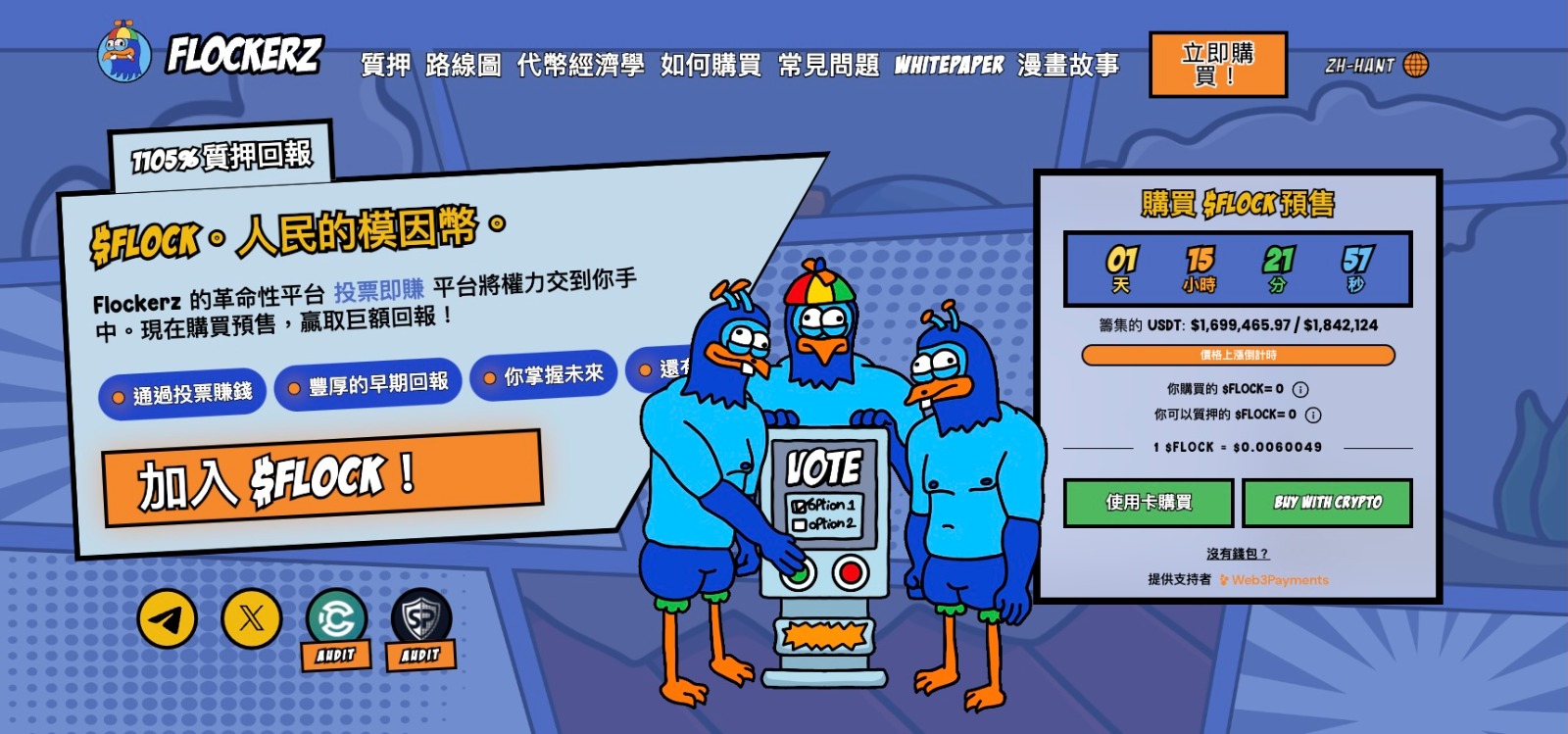 另一個值得關注項目是 Flockerz,一個以鳥類為主題meme幣,並引入了“Vote-to-Earn”(投票即賺)創新概念。持有$FLOCK代幣投資者可以對專案中重要決策進行投票,並通過參與專案管理獲得免費$FLOCK代幣作為獎勵。