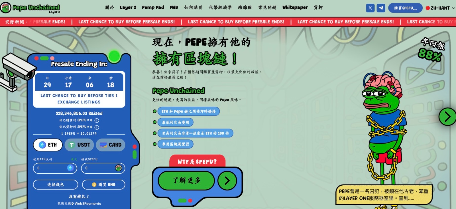 Pepe Unchained 是一個 Layer 2 Meme Coin 專案,Pepe Unchained 募資速度迅速增長,並在達成 2500 萬美元里程碑之際,宣佈了其新功能 Pepe’s Pump Pad。該功能旨在充分利用乙太坊生態系統,並解決其高費用和擁擠問題。參考Pump.fun在Solana上成功,Pepe’s Pump Pad有望複製這一模式,吸引迷因幣愛好者和高價值交易者。