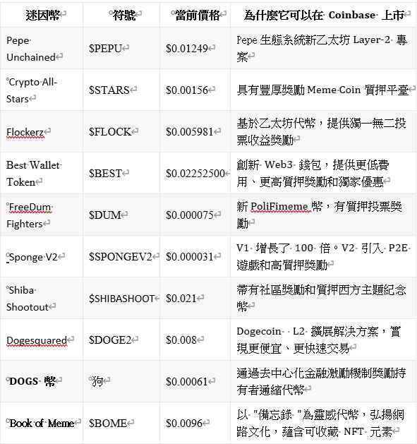 幣安近期上線了流行meme幣PEPE和FLOKI。此外,預售項目如Pepe Unchained、Crypto All-Stars和Flockerz等,也有望在未來登陸幣安平臺。