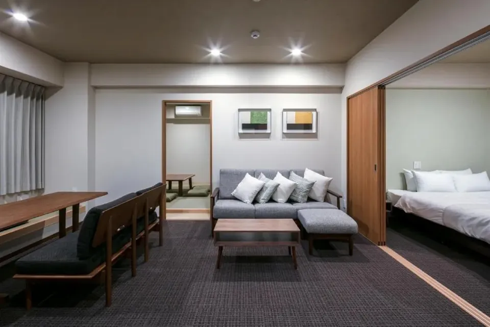 在京都鴨川旁邊的Randor酒店式公寓 京都套房-7真的超級寬敞,大行李箱在地上攤平也沒問題!特別的是雙人床房設計了獨立隔間,不用擔心在廚房下廚完,整床棉被沾滿油煙味~