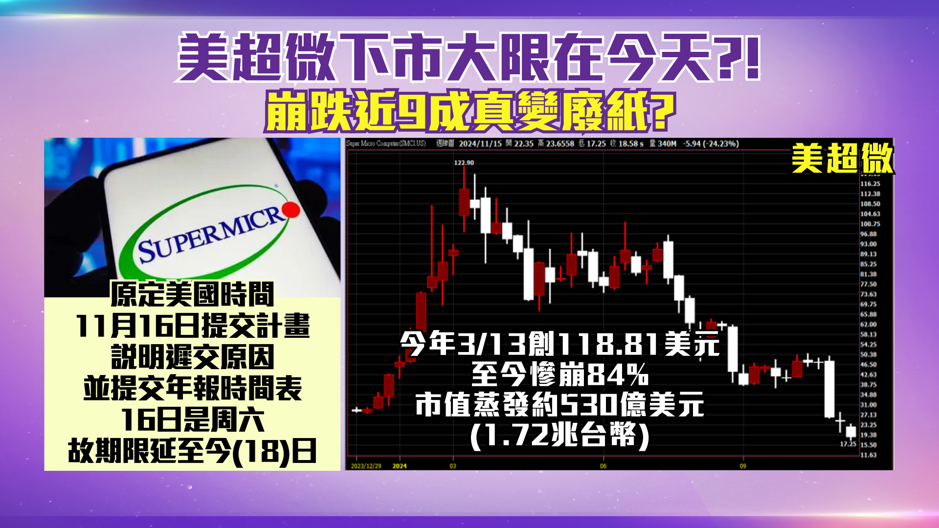 美超微因未能如期提交 10-K 年報,至今尚未找到新會計師簽署財報,正面臨被那斯達克交易所下市的危機。根據規定美超微原定於美國時間2024年11月16日前提交計畫,說明遲交原因並列出提交年報的時間表,故期限延至11/18。
