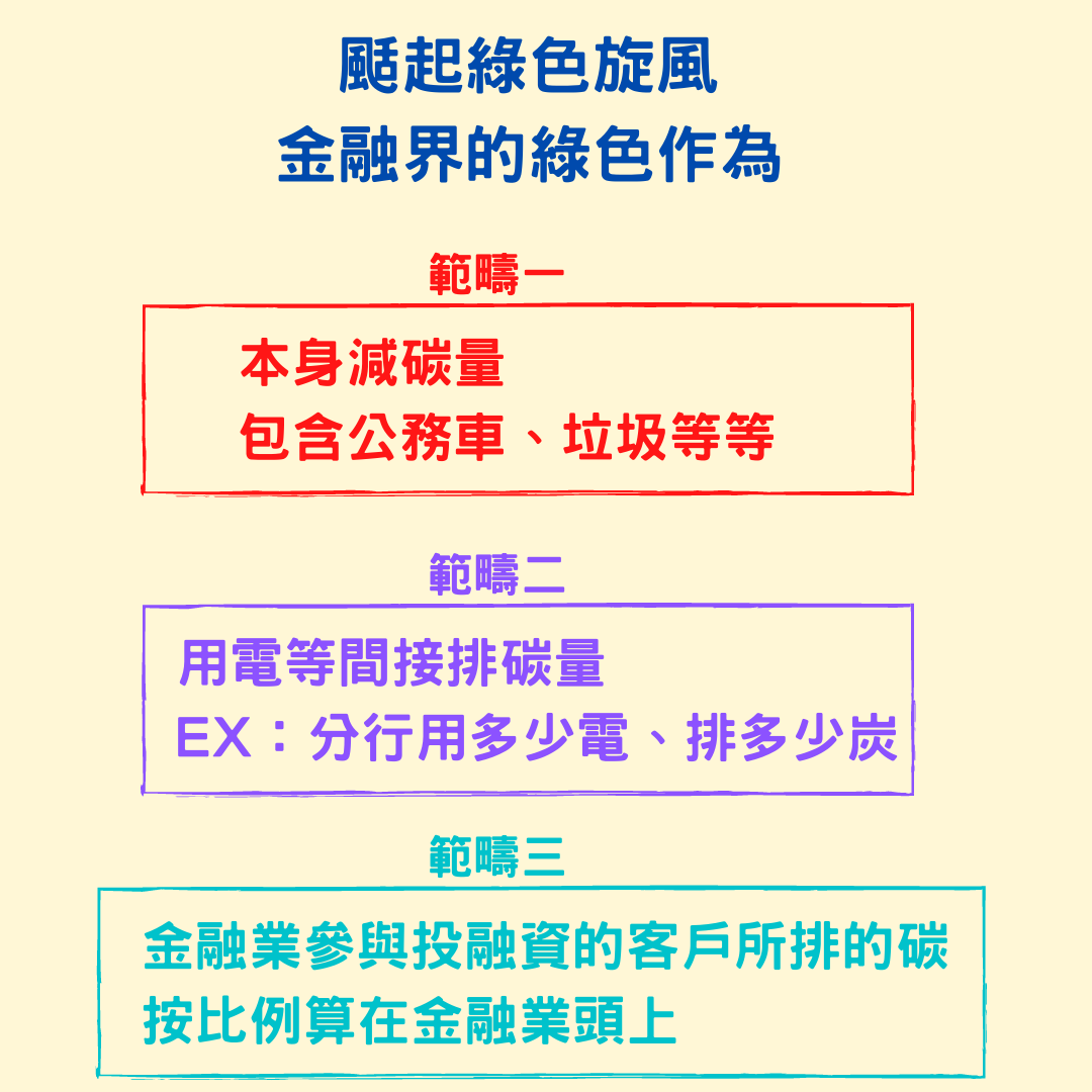 目前金融業的綠色旋風有以上三項範疇,而佔金融業碳排量最大的,是範疇三。