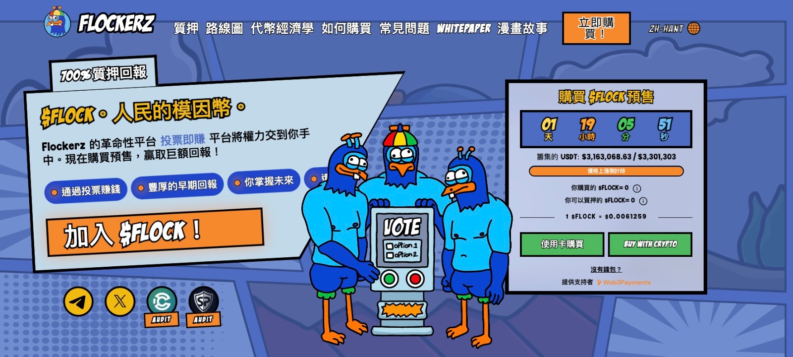 Flockerz($FLOCK)以其獨特投票賺取(Vote-to-Earn)機制,改變了傳統模因幣玩法。通過Flocktopia DAO,社區成員可以參與專案決策並賺取$FLOCK代幣,為持有者創造了一個集社區參與和收益於一體生態系統。