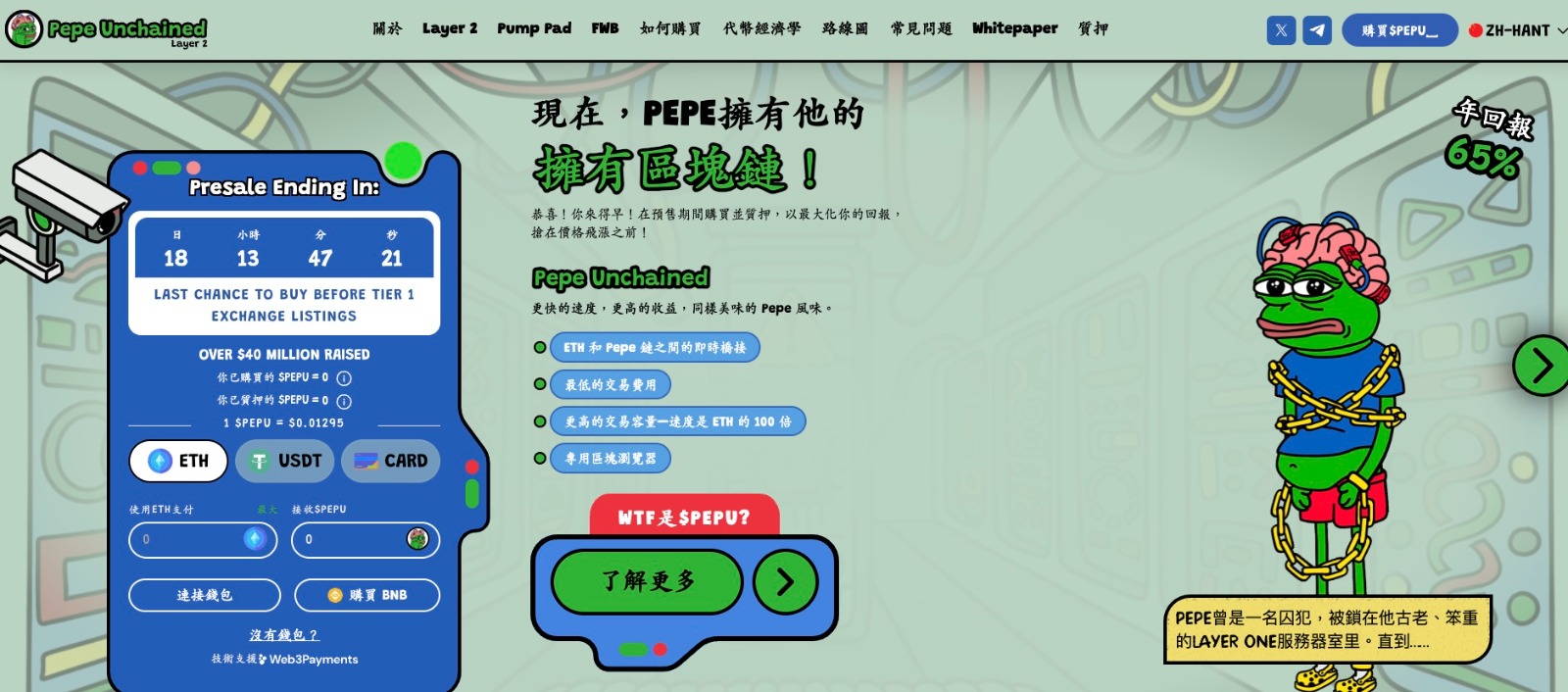Pepe Unchained($PEPU)是第四季度最值得關注新幣種,其預售已籌集超過4500萬美元,且FOMO情緒正持續升溫。自11月13日宣佈將在30天后結束預售並在一級交易所上市以來,$PEPU每天籌款速度超過100萬美元,表現令人矚目。相較於其前身Pepe($PEPE),Pepe Unchained不僅具備更高籌款能力,還將推出自己區塊鏈,計畫打造一個100倍於乙太坊速度生態系統。