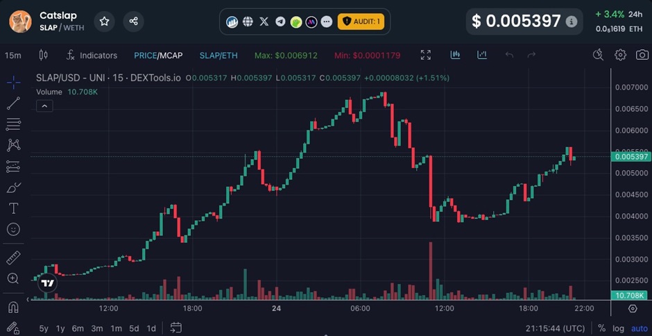 剛剛推出CatSlap($SLAP)在48小時內價格暴漲5000%,其市值從100萬美元迅速攀升至5000萬美元。這一表現將其推上模因幣市場焦點位置,特別是在Uniswap流動性池穩定支撐下,$SLAP展現出一定市場穩定性。