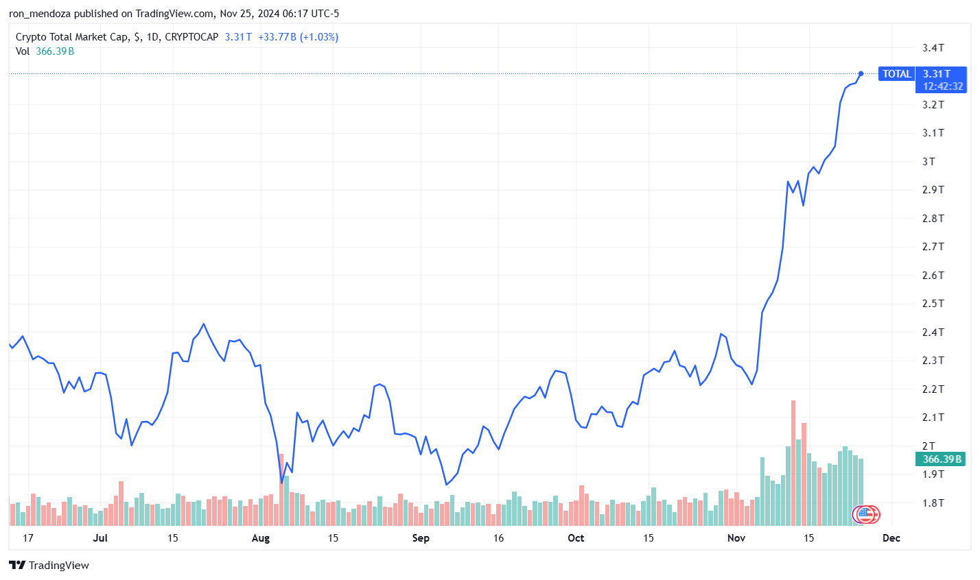 隨著比特幣多頭繼續前進,其他加密貨幣市場也紛紛跟隨,推動總市值達到3.31萬億美元——在過去30天上漲了48%,年初至今上漲了104%。