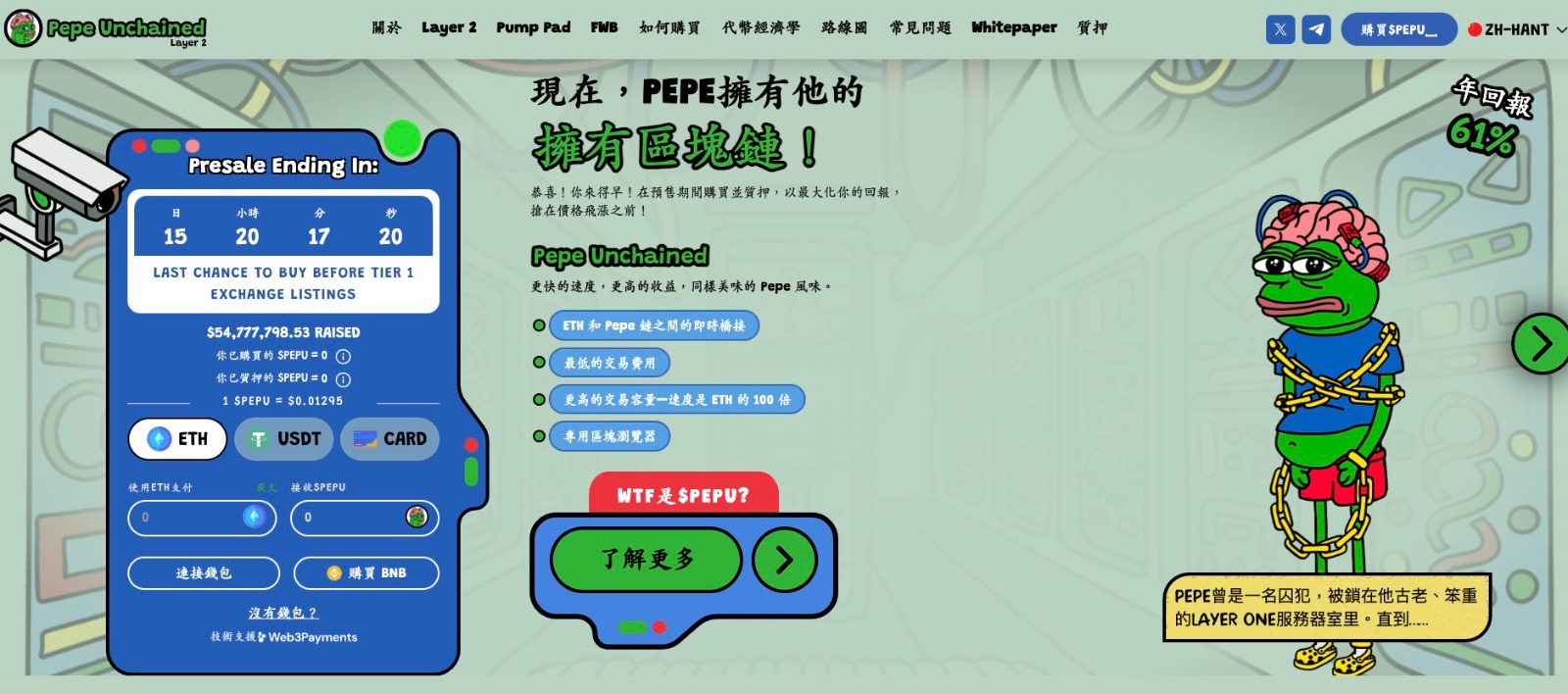 Pepe Unchained($PEPU)是第四季度最值得關注新幣種,其預售已籌集超過5500萬美元,且FOMO情緒正持續升溫。自11月13日宣佈將在30天后結束預售並在一級交易所上市以來,$PEPU每天籌款速度超過100萬美元,表現令人矚目。相較於其前身Pepe($PEPE),Pepe Unchained不僅具備更高籌款能力,還將推出自己區塊鏈,計畫打造一個100倍於乙太坊速度生態系統。