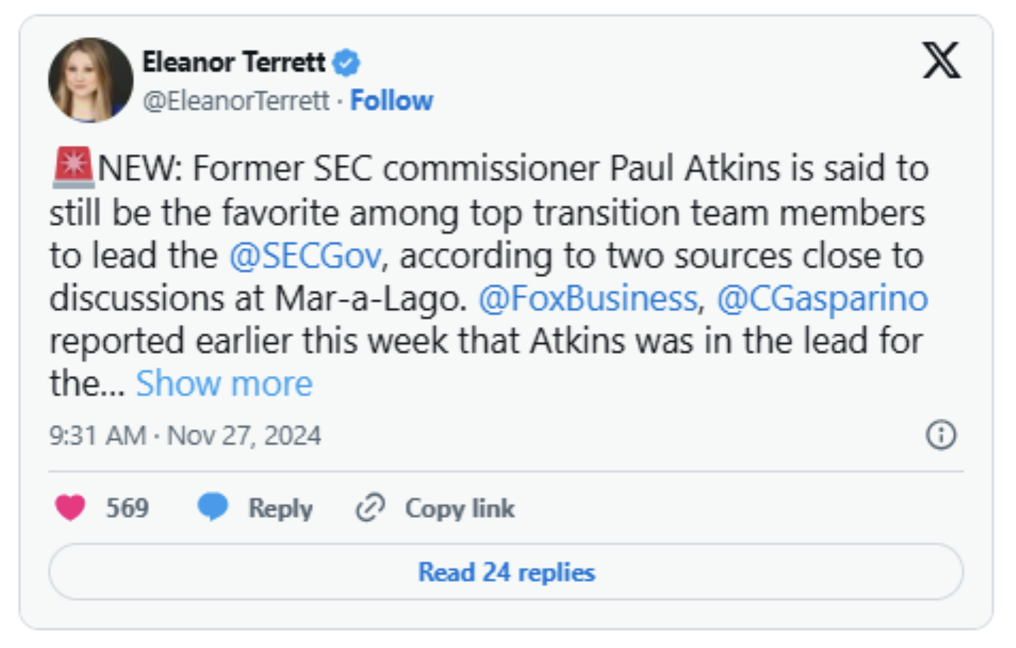 我們已經看到了這一轉變的跡象,比如支持加密技術的候選人 Paul Atkins 作為熱門人選,有望接替 Gary Gensler 出任 SEC 主席。