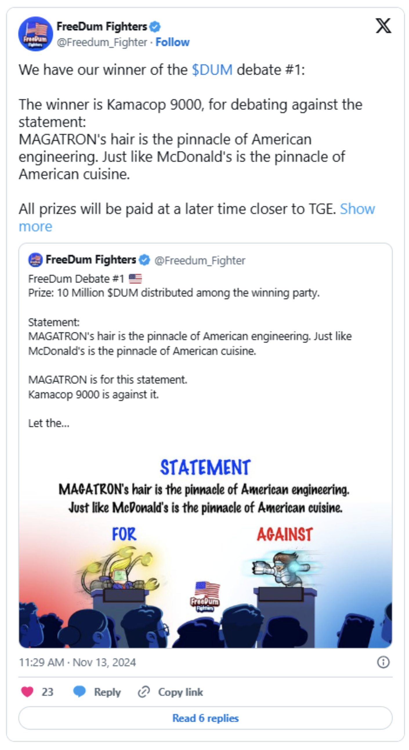 在11月5日前,FreeDum Fighters 的早期投資者通過平台的兩種質押協議為他們支持的候選人投票:川普化身MAGATRON或哈里斯化身Kamacop 9000。