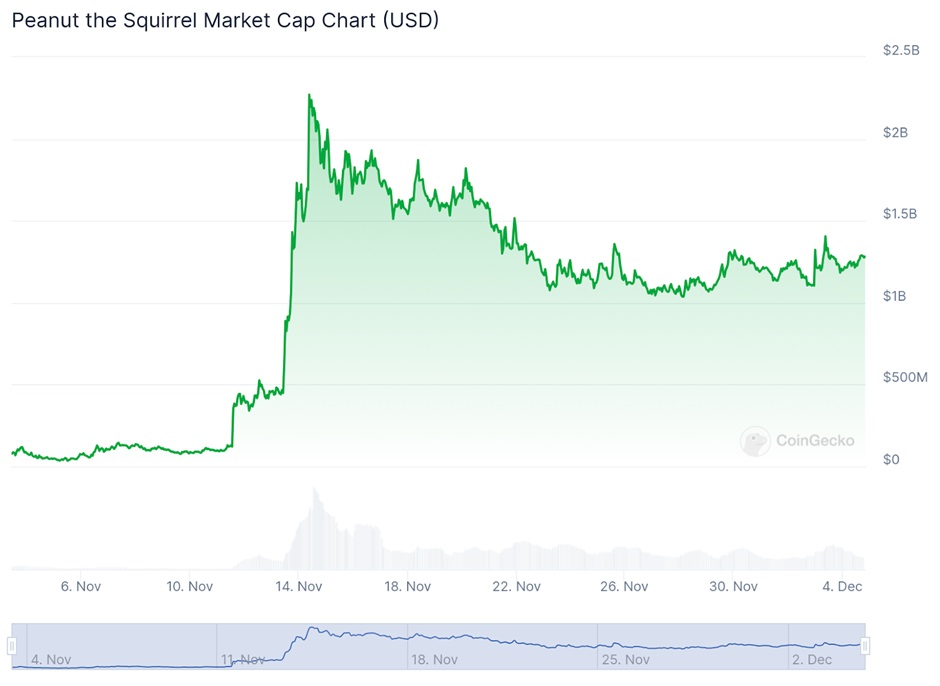 $PNUT 也成為市場的焦點,其市值突破$10億,增長速度比狗狗幣 ($DOGE) 快了135倍。