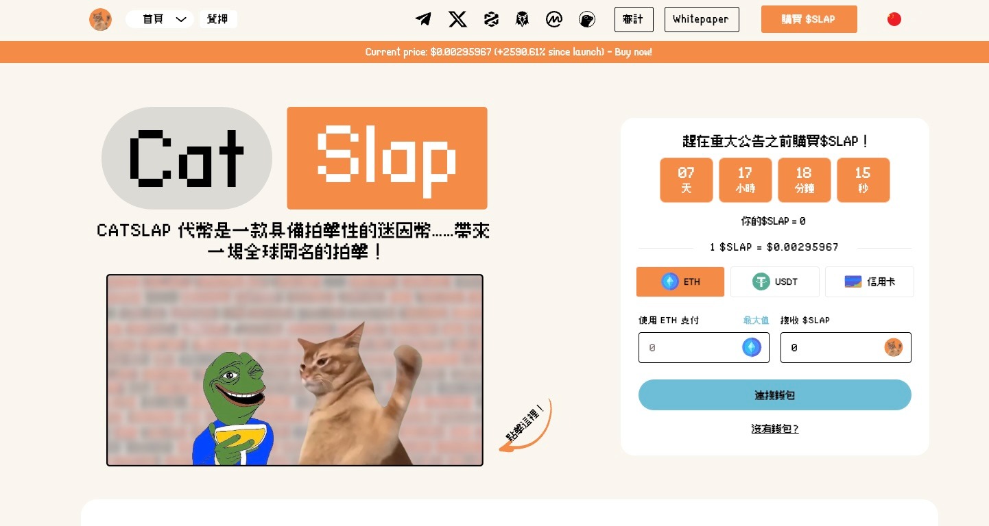 另一款貓迷因幣CatSlap (SLAP) 自推出以來,憑藉其結合去中心化金融(DeFi)創新理念,迅速吸引了市場注意。SLAP 在短短一周內價格暴漲 10 倍,市值突破$1 億,$SLAP已在CEX交易所MEXC上市,現價約為 $0.0075,並維持著 180 萬美元流動性。