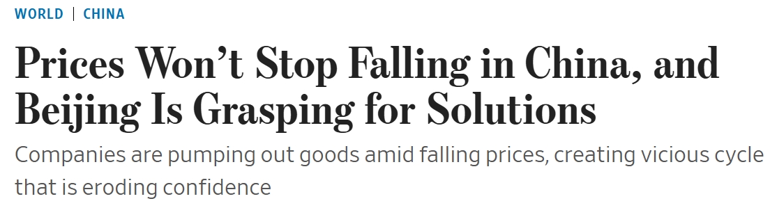 《華爾街日報》(WSJ)報道,中國物價持續下滑削弱盈利,面臨着日本此前經曆的「資産負債表衰退」,企業被迫大量出貨,抛售更多庫存,形成了惡性循環,該國目前正努力尋找解決方案。