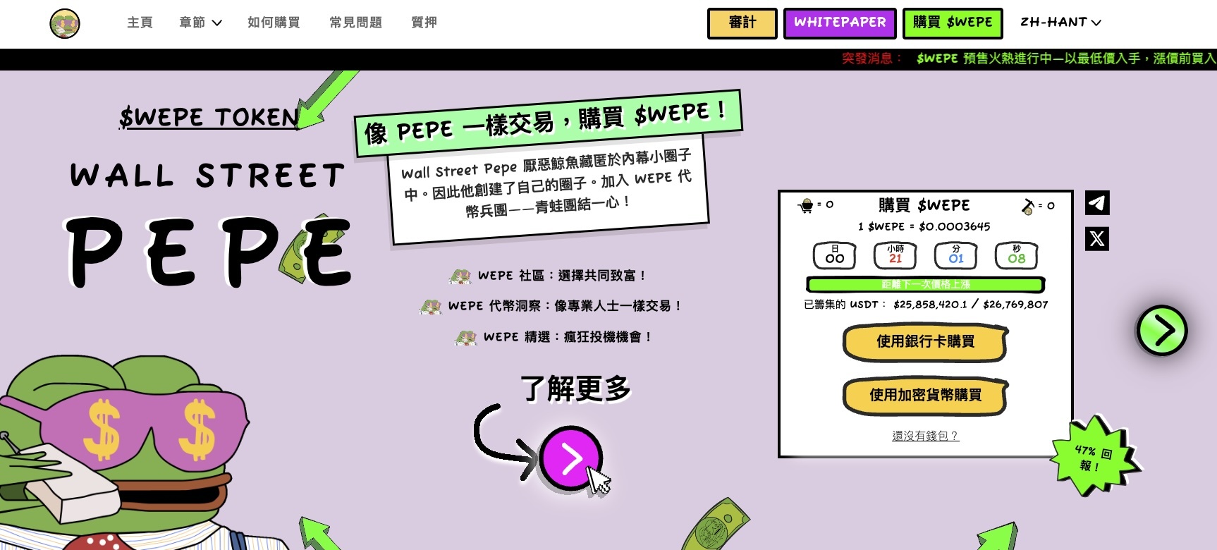加密貨幣市場中,「百倍幣」誘惑讓無數投資者趨之若鶩,而預售(ICO)階段往往是早期投資者獲得高回報最佳機會。當你錯過了 Pepe Unchained($PEPU)這個狂升 600% 機會,也不必過於 FOMO(Fear of Missing Out)。2024 年最新預售明星——Wall Street Pepe($WEPE)強勢來襲,勢頭迅猛,或將成為下一個百倍神話。本文將結合技術分析名詞,剖析如何捕捉這類預售潛力幣,讓投資者掌握致富關鍵。