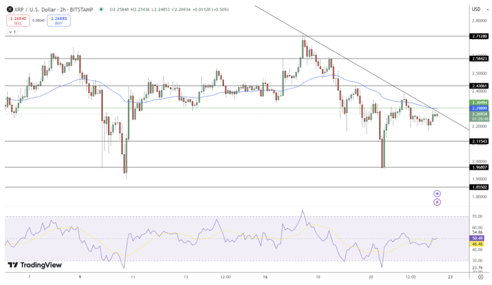 XRP 當前交易價格為 2.26 美元,24 小時內下跌了 0.53%,交易量為 125.9 億美元。該加密貨幣面臨 2.30 美元附近的下行趨勢線阻力,且該水平與支撐點相符。該水平繼續限制上漲動能,暗示除非突破,否則可能呈現賣盤傾向。