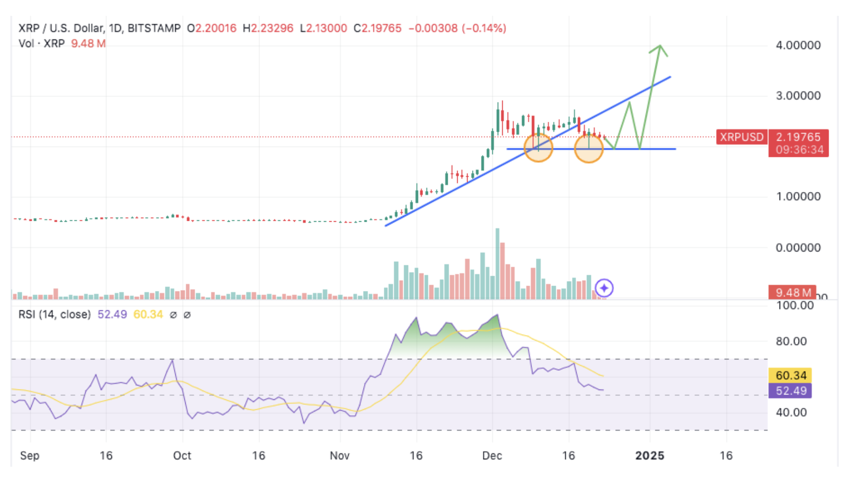 價格走勢顯示 $1.95 是一個強勁的支撐位,儘管價格突破了趨勢線支撐,這可能僅僅是受益於大選後反彈的早期買家的獲利了結行為。