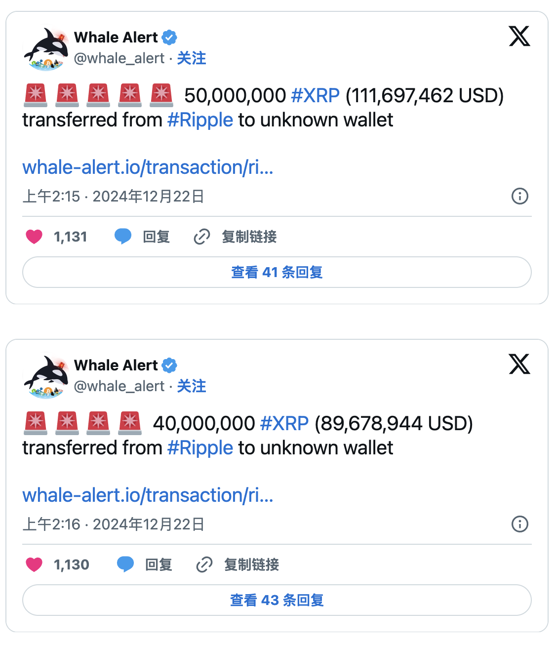 12 月 21 日,共有 9000 萬枚 XRP 被轉移至錢包地址 rGBvEZnsKB7EvqA2ZZEXRgdwDMn9G9aBk2 和 rDK26ASe17eR4ZJafRzgJxeSJNwAhziAee。