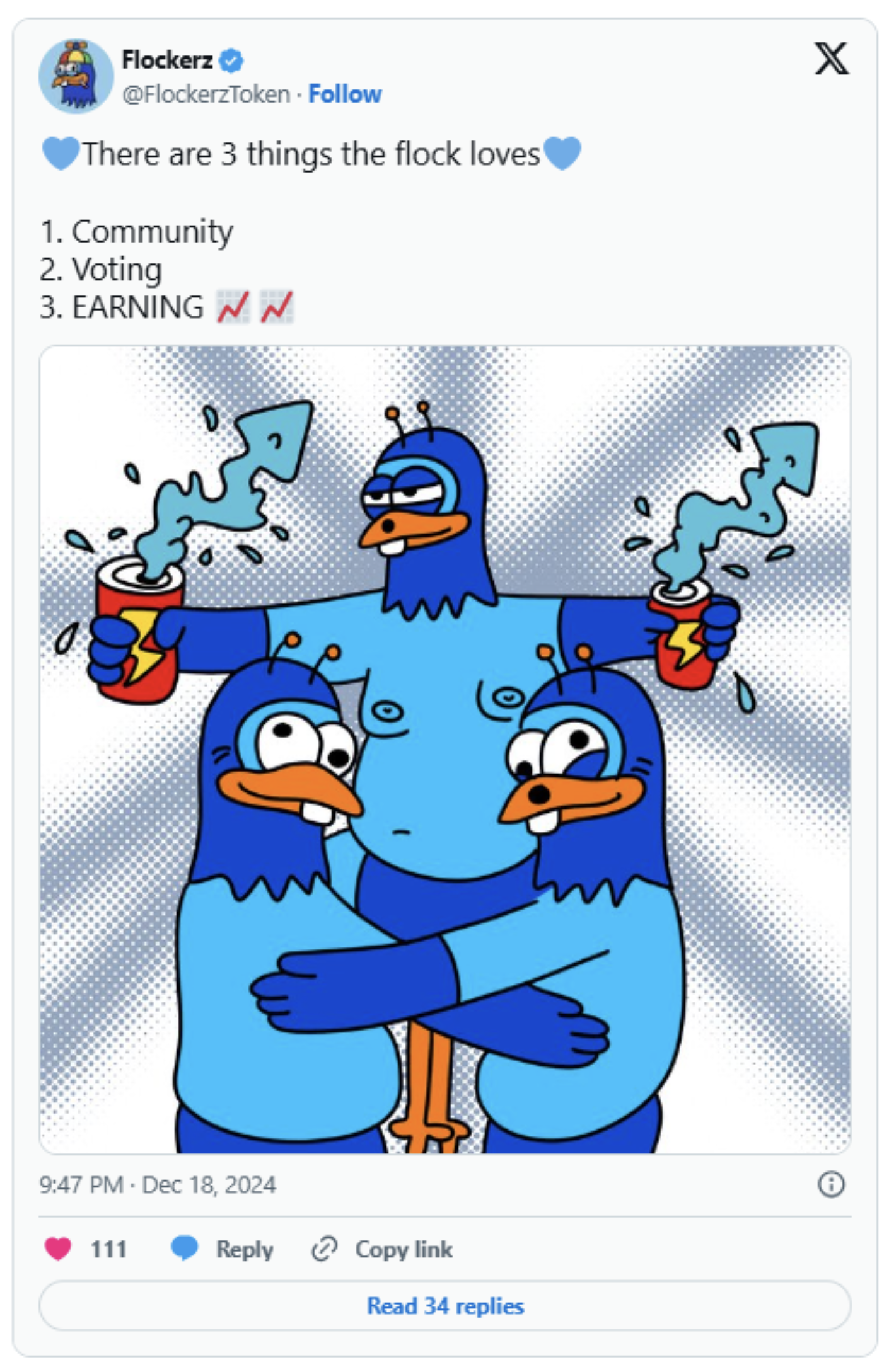 $FLOCK 代幣持有者可以參與關鍵決策投票,並在此過程中賺取代幣,這也是該項目被稱為「人民的迷因幣」的原因。