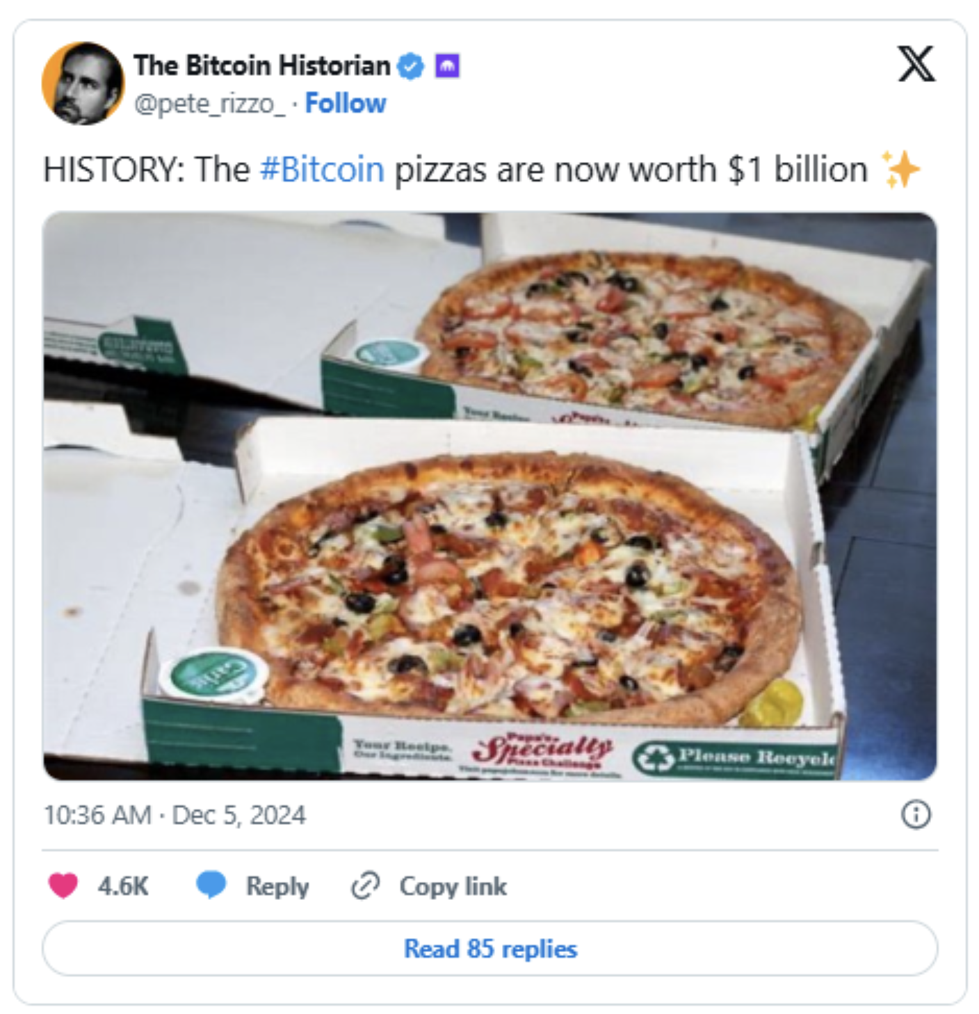 這就像在比特幣早期投資一樣。當時有人用10,000枚比特幣買了兩個披薩,而如果他們持有到今天,這些比特幣現在價值近9.89億美元。