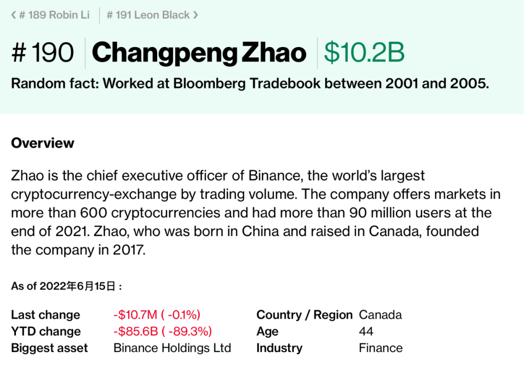 名單上領頭的、損失最慘重的就是去年底以近960億美元(當時約6100元人民幣)身家超越農夫山泉創始人鐘睒睒的4244億元人民幣,登頂華人首富的世界最大加密貨幣交易所幣安(Biance)創辦人趙長鵬。數據顯示,其身家已經僅剩102億美元,財富蒸發了將近89%。有網友戲稱,這是“一夜返貧”。