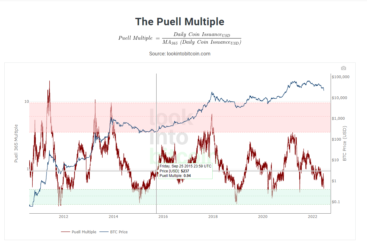 依照前幾次跌幅的%數來看,平均每次牛轉熊都要跌80%左右,自去年高點69000之後已經跌了70%,其實還有10%左右的空間,要布局正是準備開始的時機,再從挖礦的分析圖表也可以看到(下圖),此為pm圖,當日挖礦收益/過去365天平均,即可去判定現在市場榮枯的一個統計圖表,目前將至綠色區域,如觀察仔細的朋友可以發現,以往處於綠色區域時皆為市場最低檔時期,對照價格也是盤整居多,時長最久半年最短兩個月,可以預測接下來進入綠色區域,將維持2~7個月的低檔,但是一旦撐過這段時期離開綠色區域往上,幣價的拉升非常可觀,所以為何說幣圈老手非常喜歡接下來的2~7個月,趁此時去建立部位,籌備資金進場,不管是透過"礦機" "算力機" 或是定期定額現貨,都是不錯存便宜幣的時機。