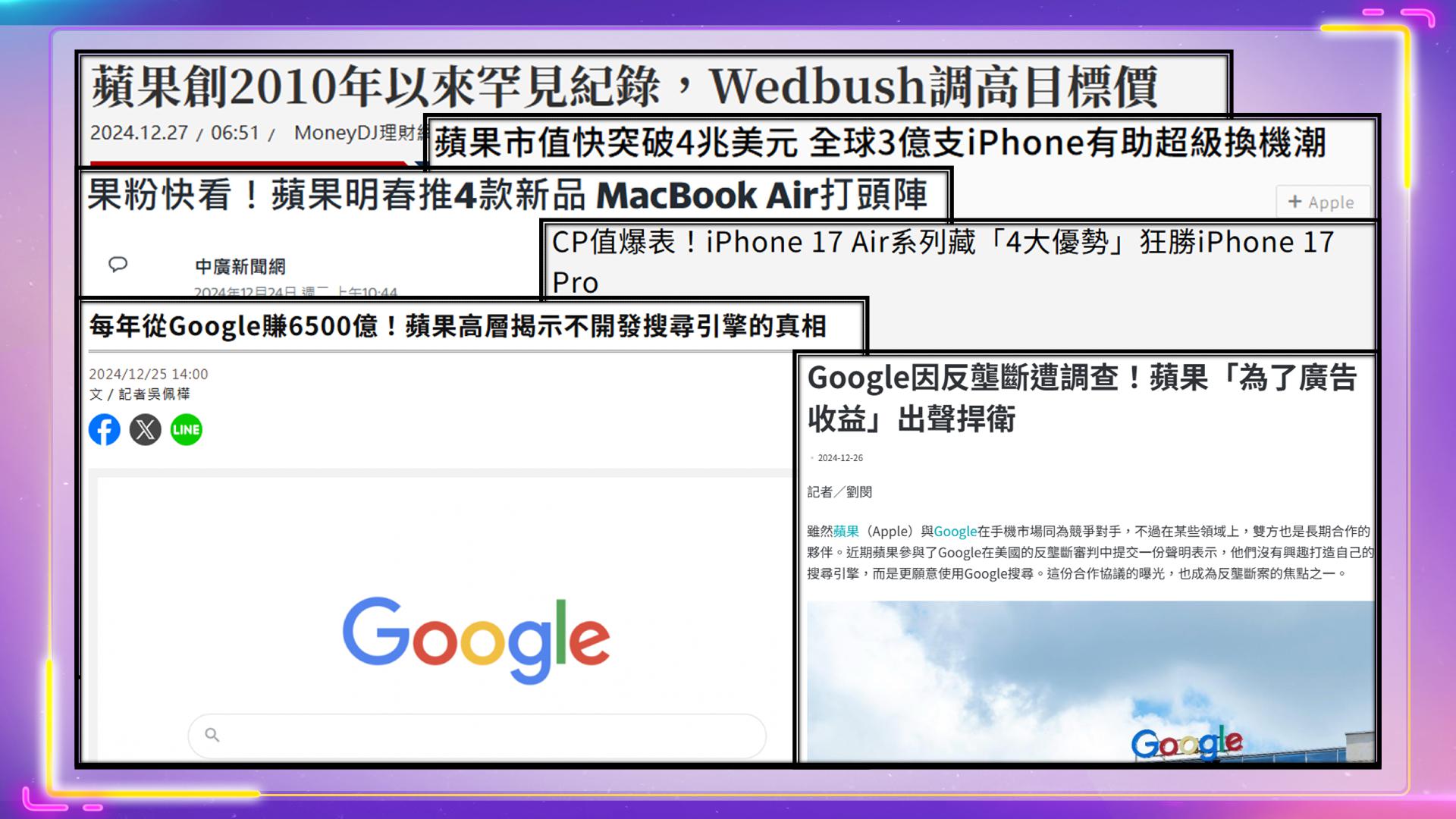 蘋果股價連續5週(截至2024年12月20日為止)週線漲幅至少達2%、創2010年以來最長紀錄。2024/11/12迄今、蘋果股價僅有6個交易日收低,這段期間累計漲幅達15.5%。蘋果週四上漲0.32%、收259.02美元,再創歷史收盤新高,市值達3.915兆美元,年初迄今漲幅達34.53%。