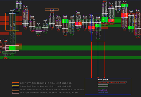 你可以看到,在EBC訂單流工具介面,每一根K線上下都標注了不止一個數字,包括COT high,COT low,Delta,成交量,失衡等等,讓我們對整個盤面的情況一目了然。