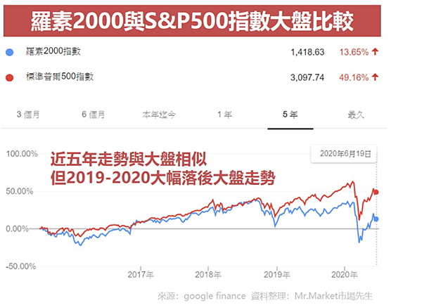 下圖是羅素2000指數和美股大盤S&P500指數的對比,