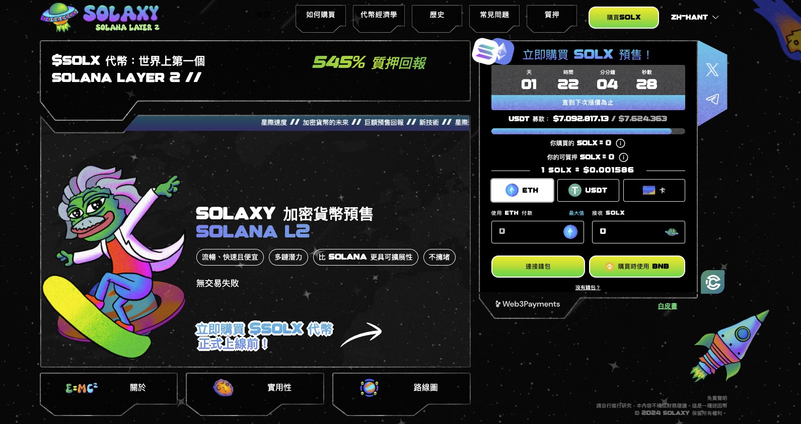 該代幣還作為每年550%的質押獎勵的入口。自預售開始以來,已有超過20億個$SOLX代幣被質押。Solaxy代幣的總供應量為1380億個。