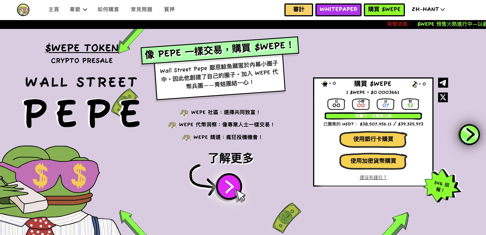 要留意,$WEPE仍在預售階段,在預售結束後再上市DEX及CEX,建議投資人可進入官方網站、X及Telegram了解預售最新資訊。