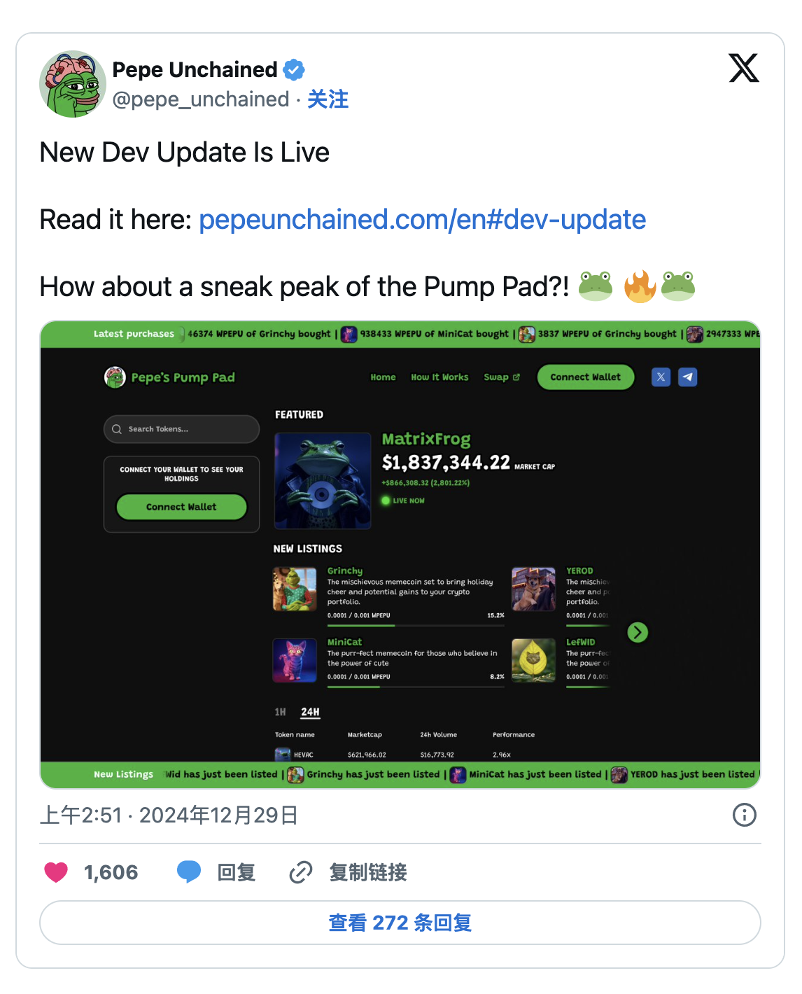其他尚未引起廣泛關注的PTF主題代幣可能會受益於此網路迷因的重新流行。例如,Pepe Unchained ($PEPU) 正準備推出其新功能——Pump Pad。該工具將為迷因幣愛好者提供類似於Pump.fun的平台,用於快速推出新代幣。