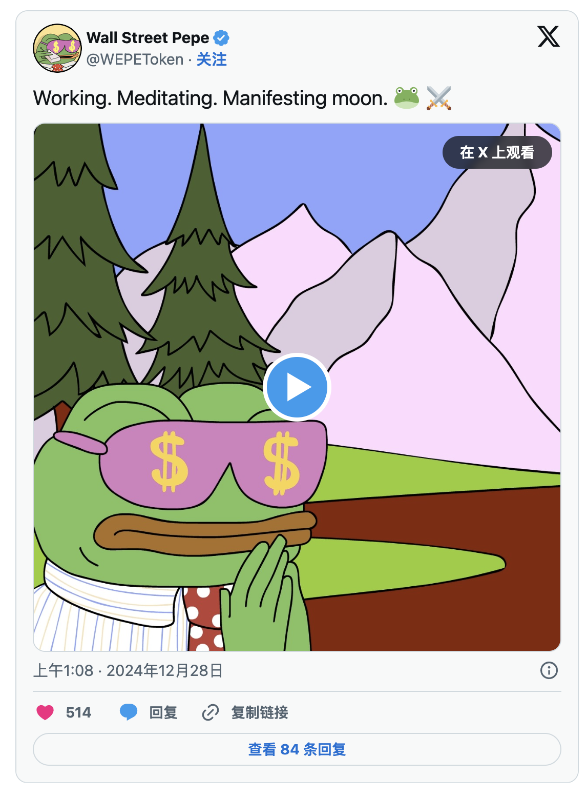 Wall Street Pepe的口號「青蛙團結一心」捕捉了一個青蛙社區的精髓,表達了這個社區願意繼續創新並接受新的「主題為基礎的迷因」。