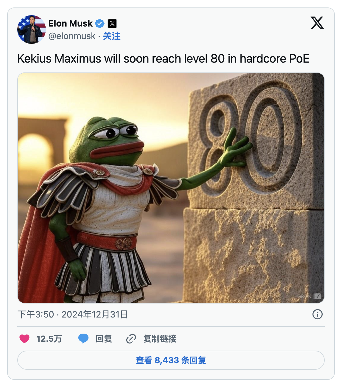 早在12月,億萬富翁迷因幣愛好者馬斯克就轉發了兩條Kekius Maximus相關推文。第一條是2024年12月10日由 @ALX發布的圖像,由Grok生成,展示了我們的青蛙軍團。