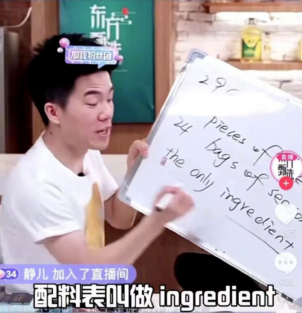 很多人認識他是通過牛排的帶貨視頻,他先是普及了不同場景牛排單詞的用法,如“原切牛排”的英語是“Original cutting”,熟一點的牛排用“Medium well”表達,12片牛排是12 pieces of steak,24包調料是24 bags of seasonings,配料表是ingredient。