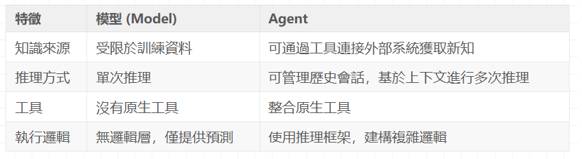 現在,你可能會問:“agent 和模型到底有什麼區別?”這裡有一個簡單的對比: