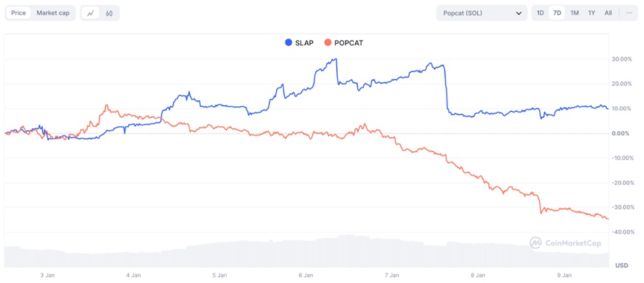 目前在MEXC交易所上,$SLAP價格為$0.00288,過去七天上漲了10%,儘管整個加密市場價值有所回檔。而相比之下,Popcat的價格暴跌了35%。
