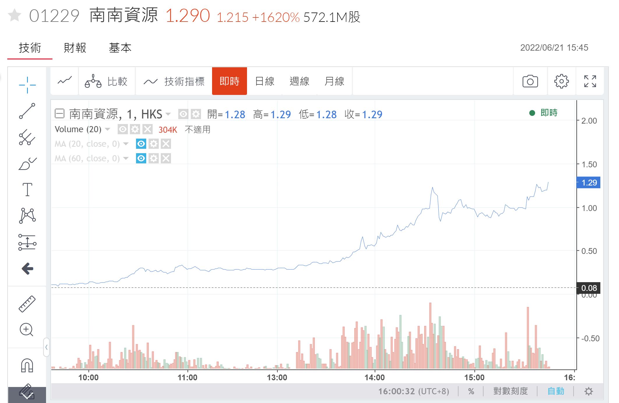 港股南南資源今天瘋狂拉漲,上午大漲至300%附近,隨後橫盤一段時間,午後開始更強勢的飆升,盤中最高漲幅超1600%,令人驚嘆。