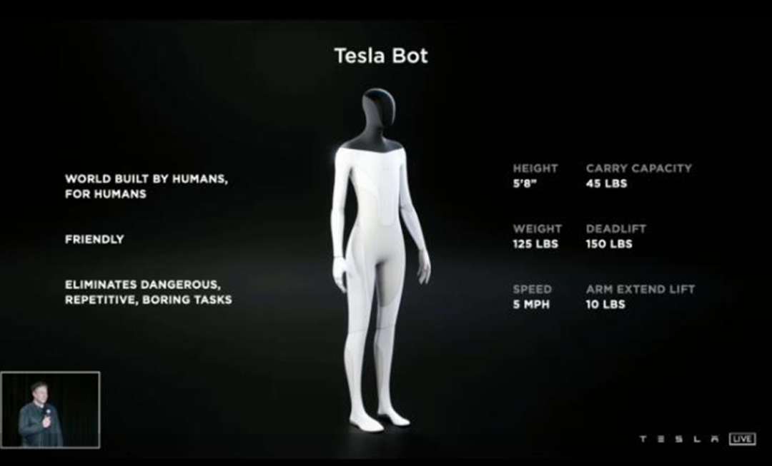 特斯拉內部將Tesla Bot命名為“Optimus(擎天柱)”。其身高1.72m,重量57kg,負載20kg(手臂附加5kg),行動速度最高可達8公里/小時。其表面由“輕質材料”製成,比人的皮膚更為光滑。
