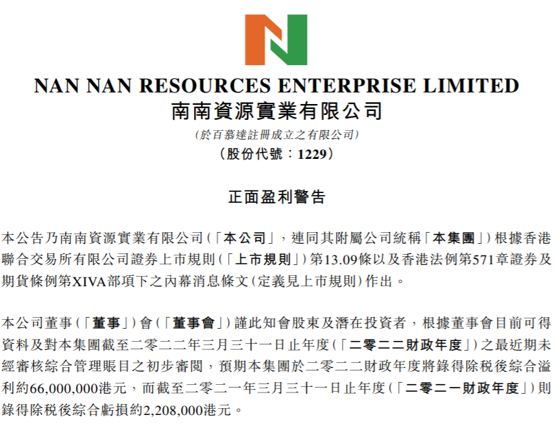 公告稱,預期轉虧為盈主要由於下列因素:煤礦業務產生的收益大幅飆升至約2.75億港元,較2021財政年度增加約1.74億港元,主要由於地方需求特別旺盛及偶爾由地方機關協調的供應安排;受惠於售價上升;指定為按公平值列賬並在損益內處理的金融負債的可換股債券的公平值虧損約為1100萬港元(2021年:約2485.7萬港元),顯示指定為按公平值列賬並在損益內處理的金融負債的可換股債券的公平值進一步增加約1100萬港元。