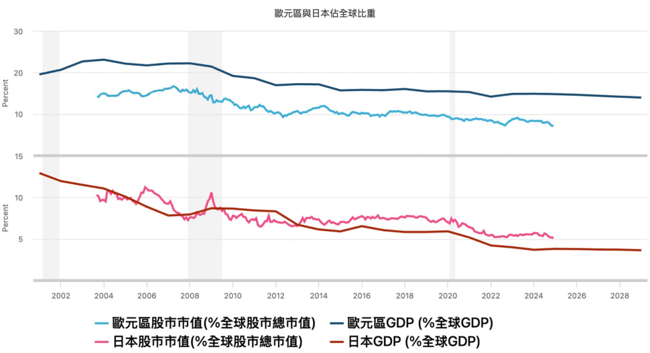 承上。因此換言之,歐洲與日本股市及GDP佔全球比重持續下降,反映其長期競爭力不足,主要原因包括中國競爭加劇、汽車產業成長乏力以及錯過本輪生產力循環。